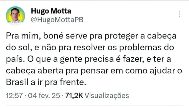 Em resposta ao uso do boné, Hugo Motta disse que “boné serve para proteger a cabeça do sol, e não pra resolver os problemas do país”.